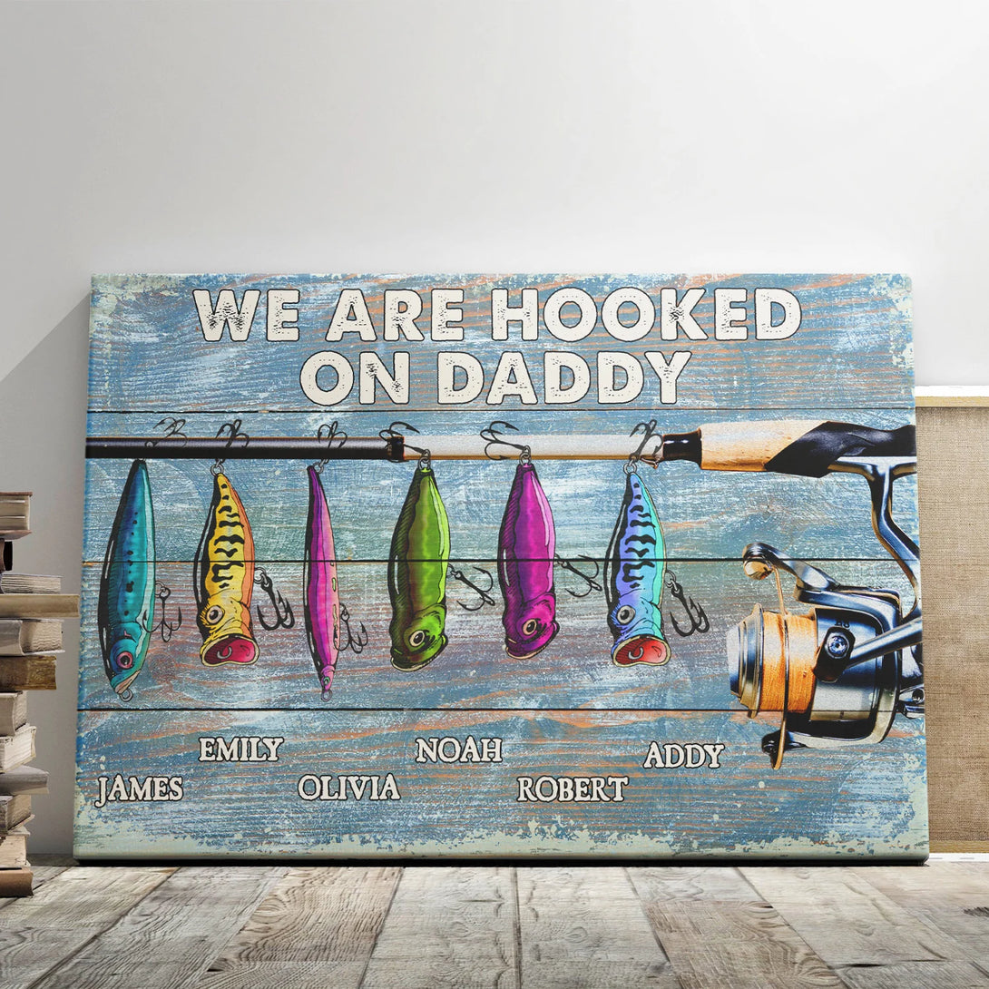 Dad Fishing Personalized Canvas Prints - Custom Text - 5 Sizes - Fishing Rod Canvas, We're Hooked On Daddy, Happy Father's Day - Dem Canvas