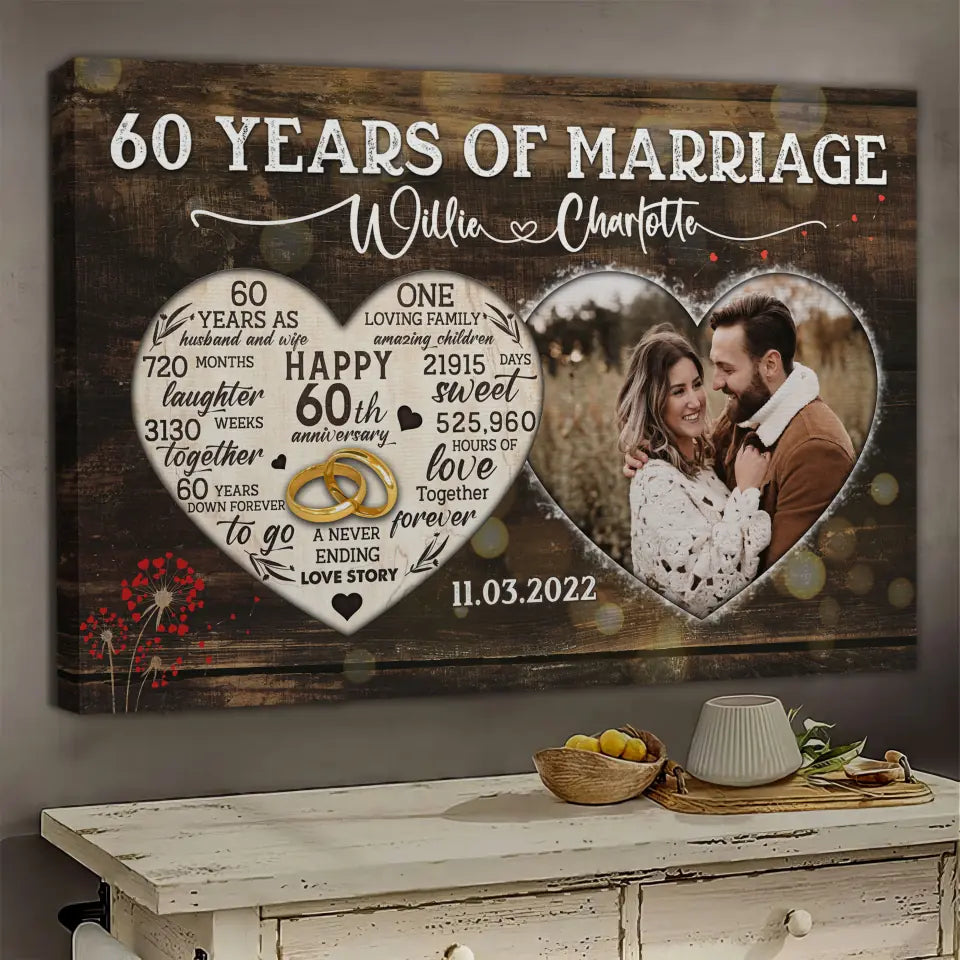 Personalized Canvas Prints, Custom Photo, Gifts For Couples, 60th Anniversary Gifts For Husband And Wife, Heart Frame 60 Years Of Marriage Dem Canvas