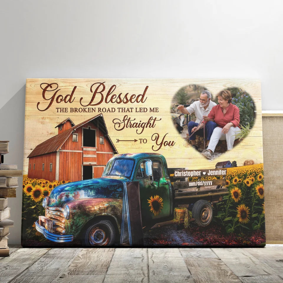 Personalized Canvas Prints Custom Photo, Gifts For Couples, Anniversary Gifts, Sunflower Pickup Truck, Red Barn God Blessed The Broken Road Dem Canvas