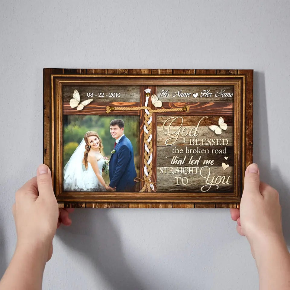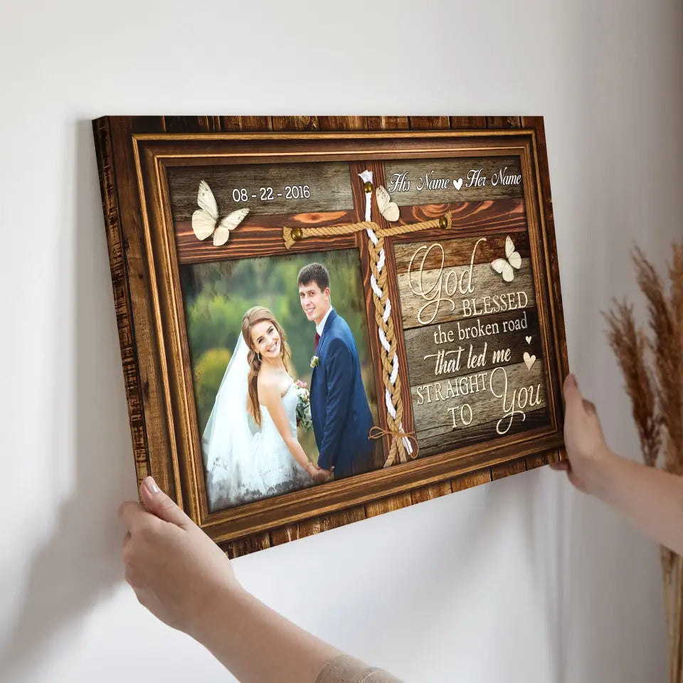 Personalized Canvas Prints, Custom Photo, Gifts For Couples, Anniversary Gifts, Cross Frame God Bless The Broken Road Dem Canvas