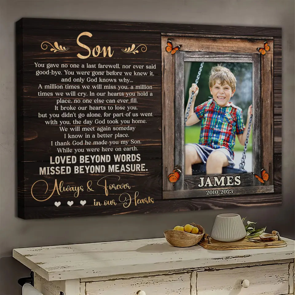 Personalized Canvas Prints, Memorial Gifts For Loss Of Son, Memorial Canvas for Son, Always And Forever In Our Hearts Dem Canvas