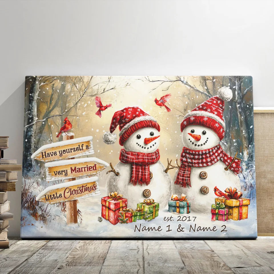 The Couple, Family Christmas Personalized Canvas Prints - Custom Text & Date - 5 Sizes - Snowman Couple, Married Little Christmas - Dem Canvas